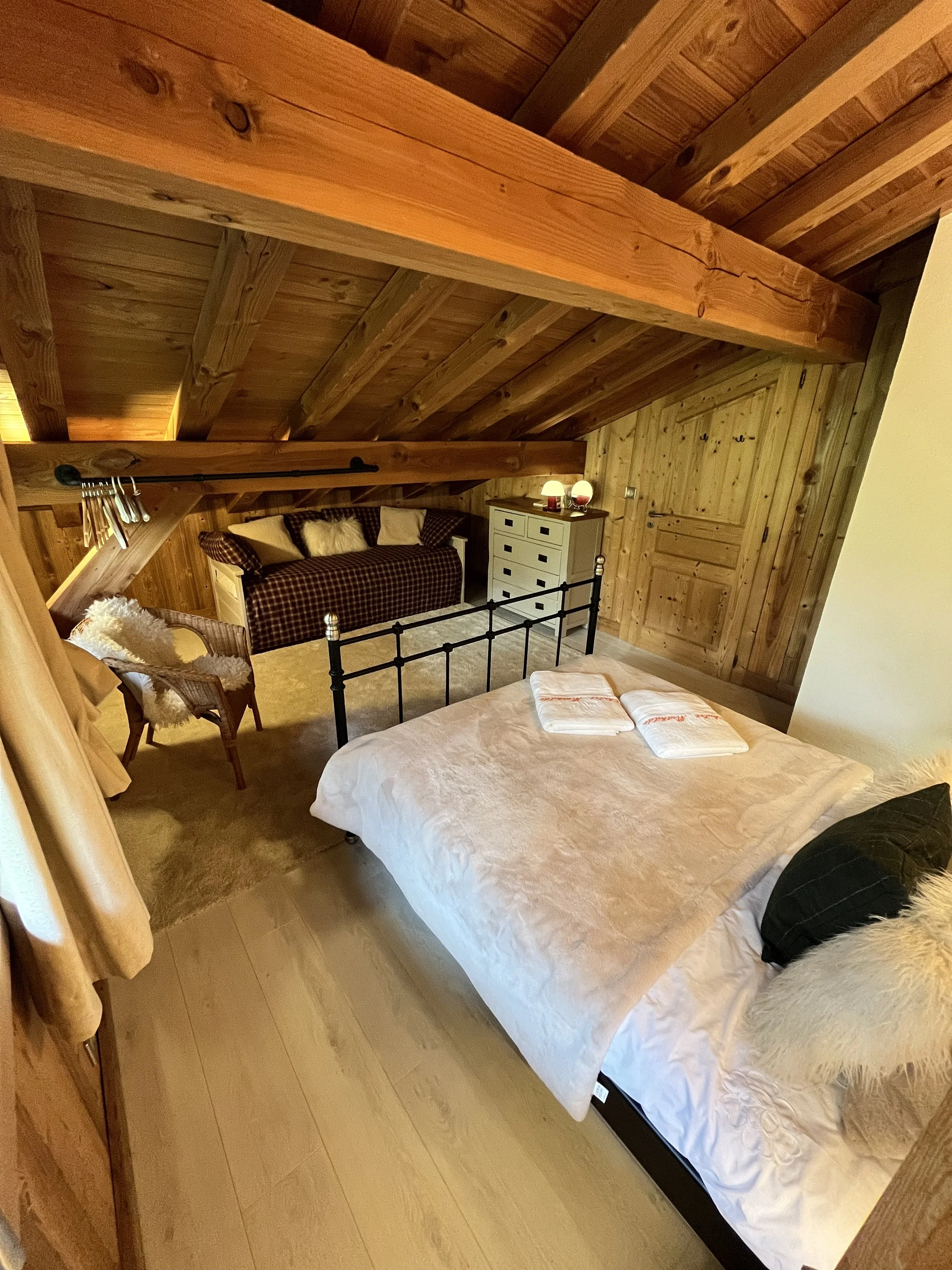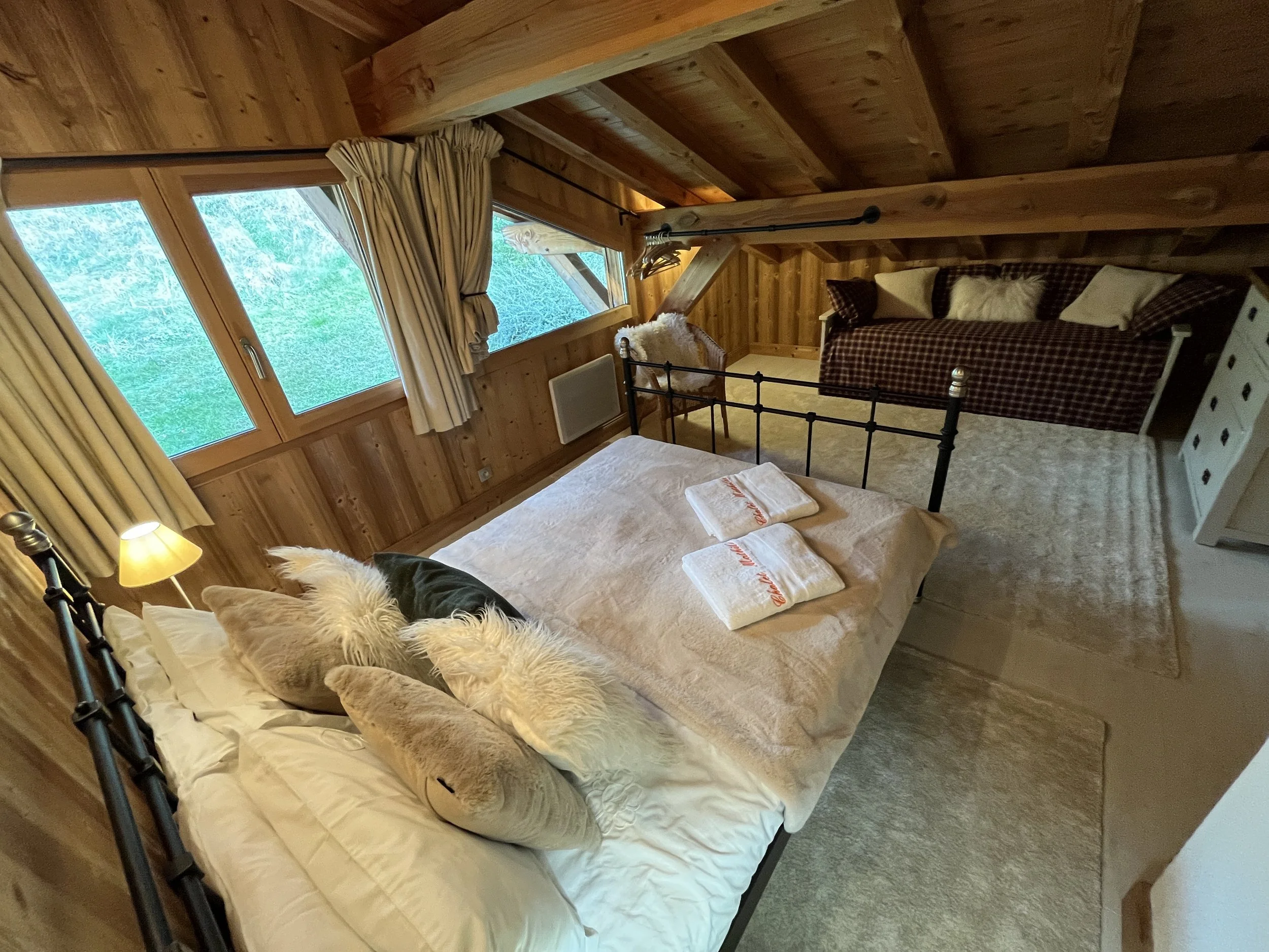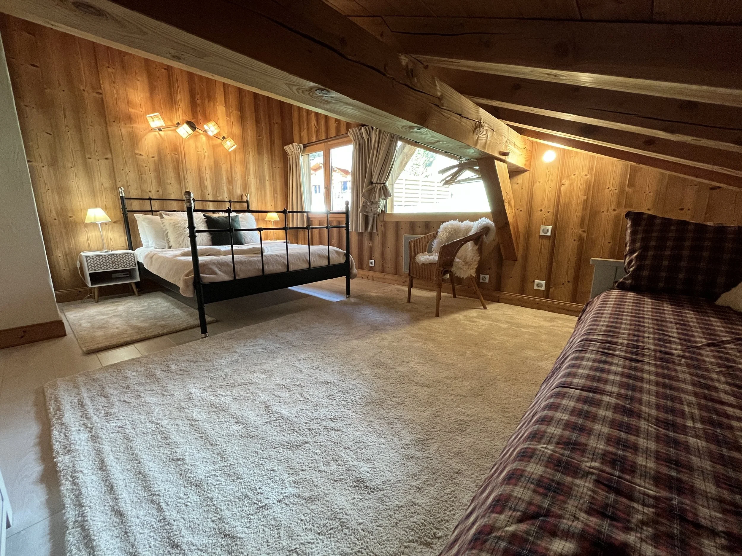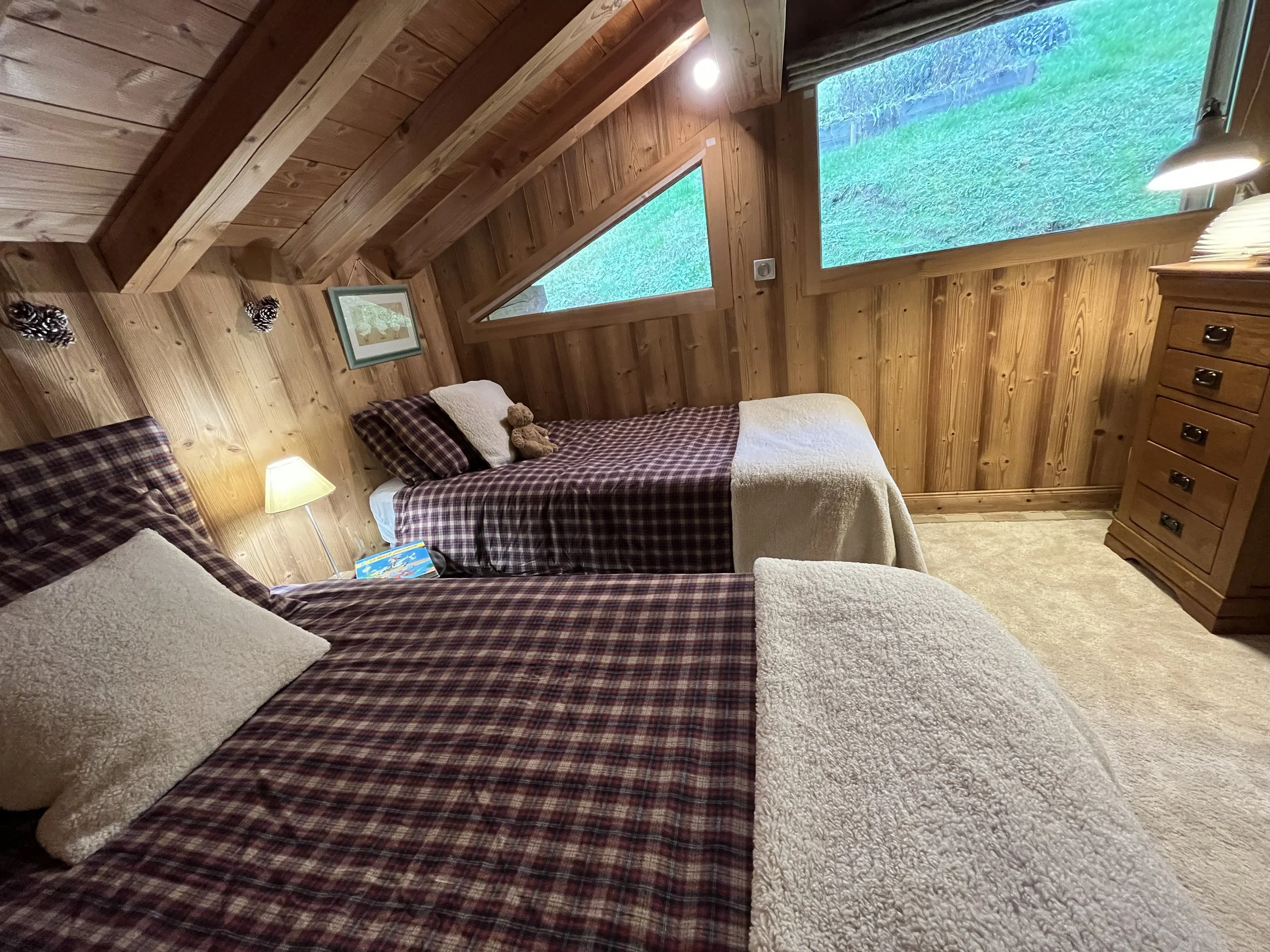 On the upper level, the main chalet has a fully equipped kitchen open to the dining room with exposed framework and large sliding windows giving access to the two terraces and the garden. A living room with wood stove, a second living room with a reading corner, a twin-bed bedroom and a large shower room with toilet complete this floor. On the second floor are 3 double bedrooms (one has an extra bed + drawer bed to sleep an additional 2 guest/kids) with exposed beams and a shower room with WC.