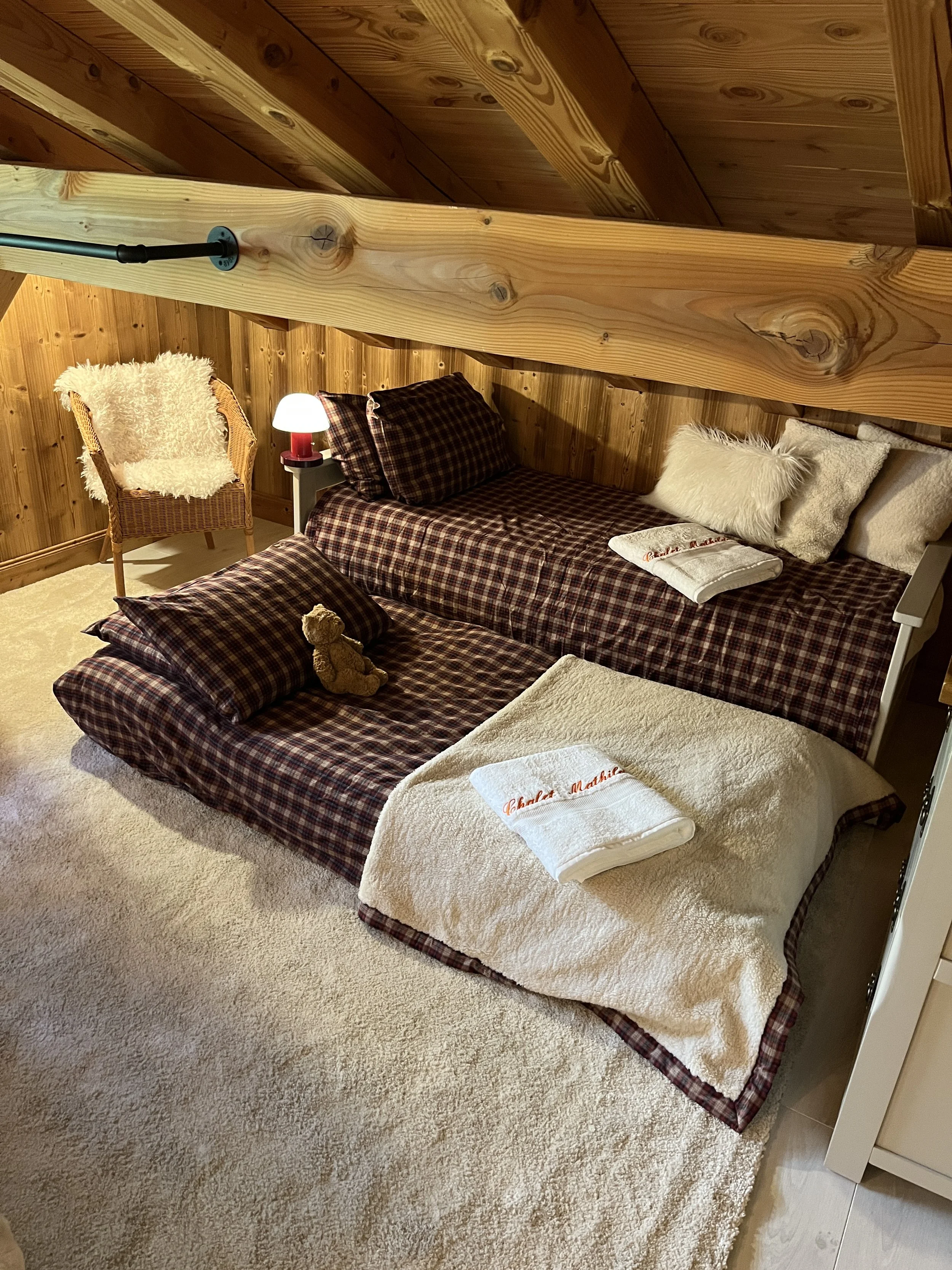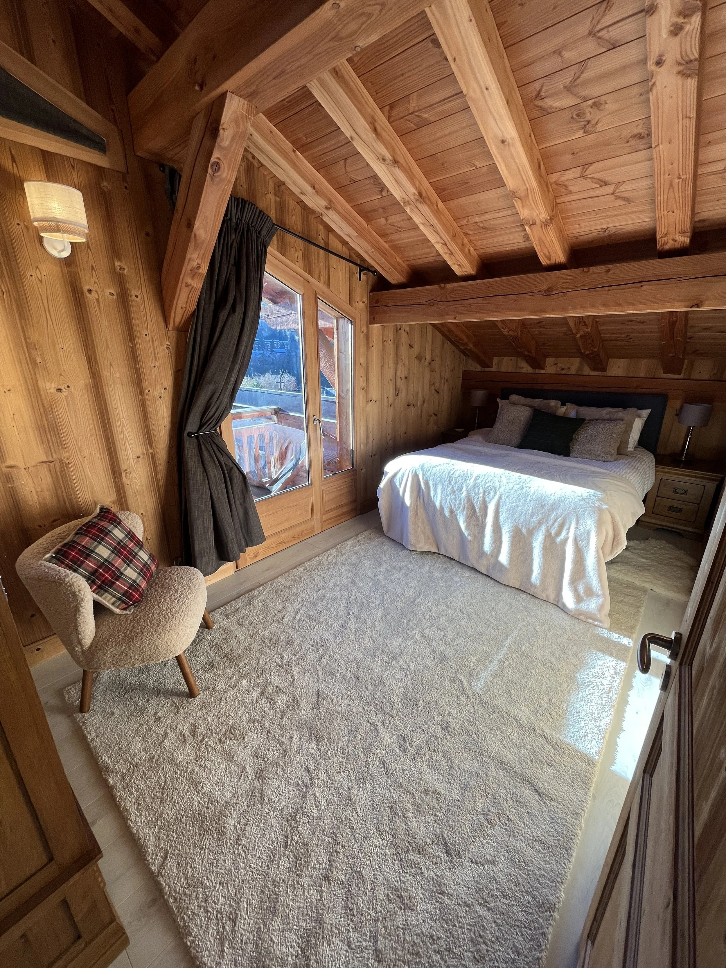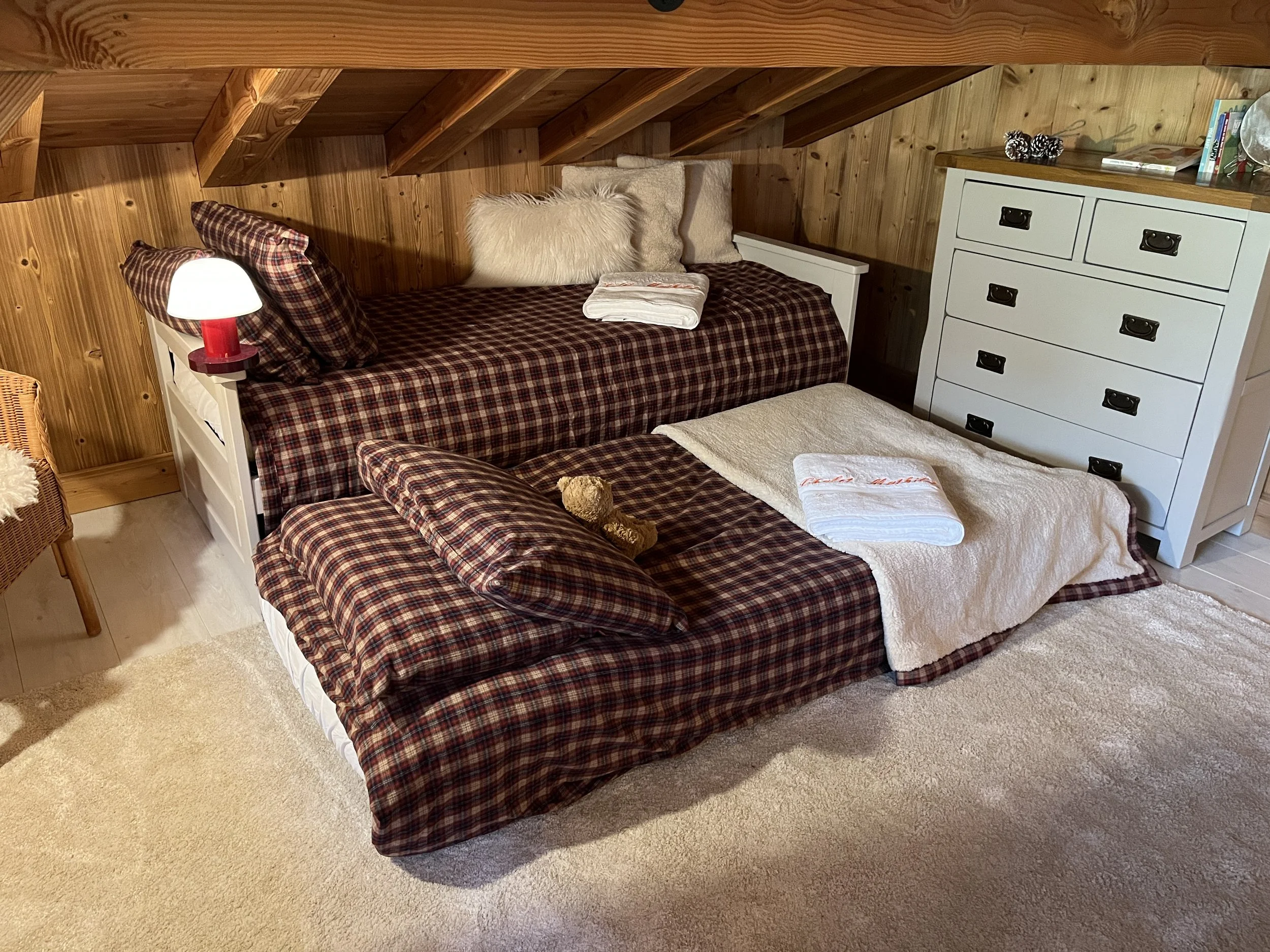 On the upper level, the main chalet has a fully equipped kitchen open to the dining room with exposed framework and large sliding windows giving access to the two terraces and the garden. A living room with wood stove, a second living room with a reading corner, a twin-bed bedroom and a large shower room with toilet complete this floor. On the second floor are 3 double bedrooms (one has an extra bed + drawer bed to sleep an additional 2 guest/kids) with exposed beams and a shower room with WC.