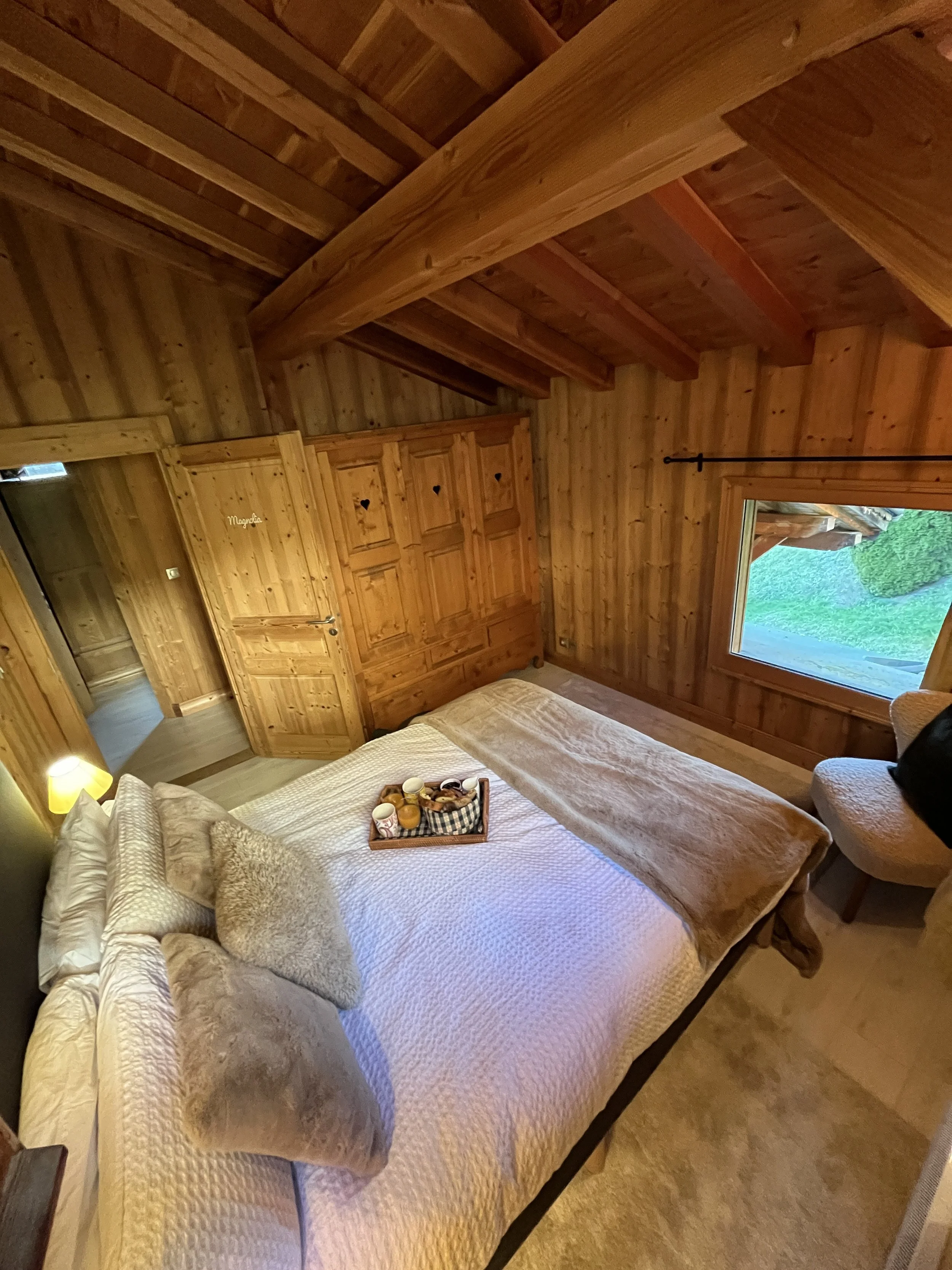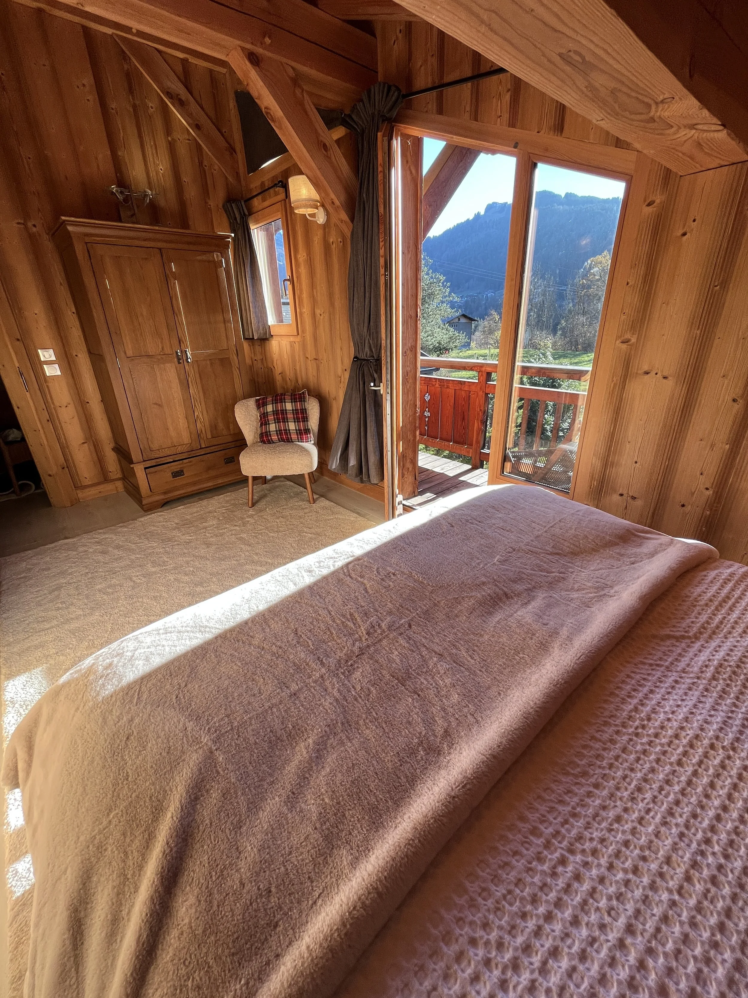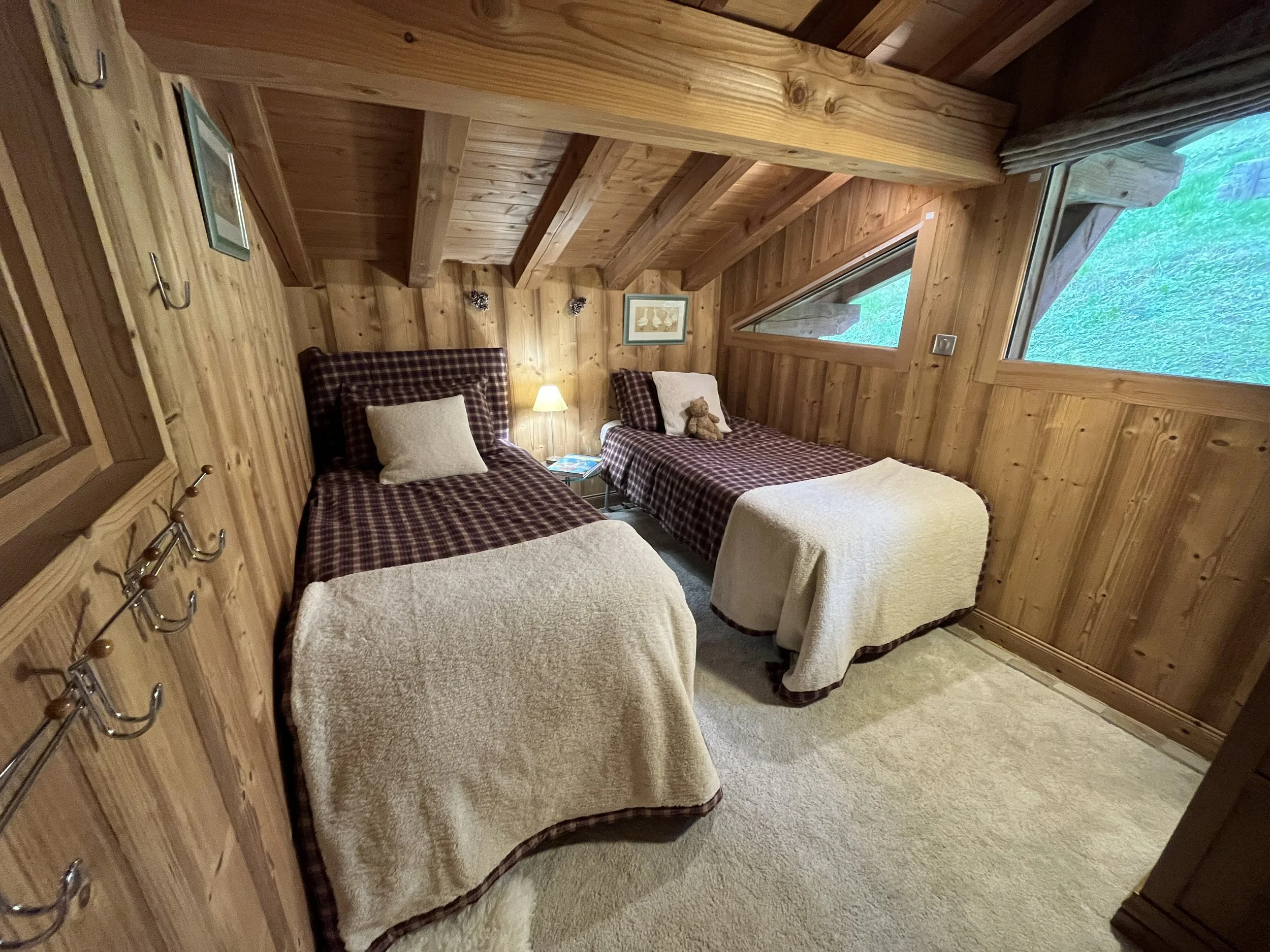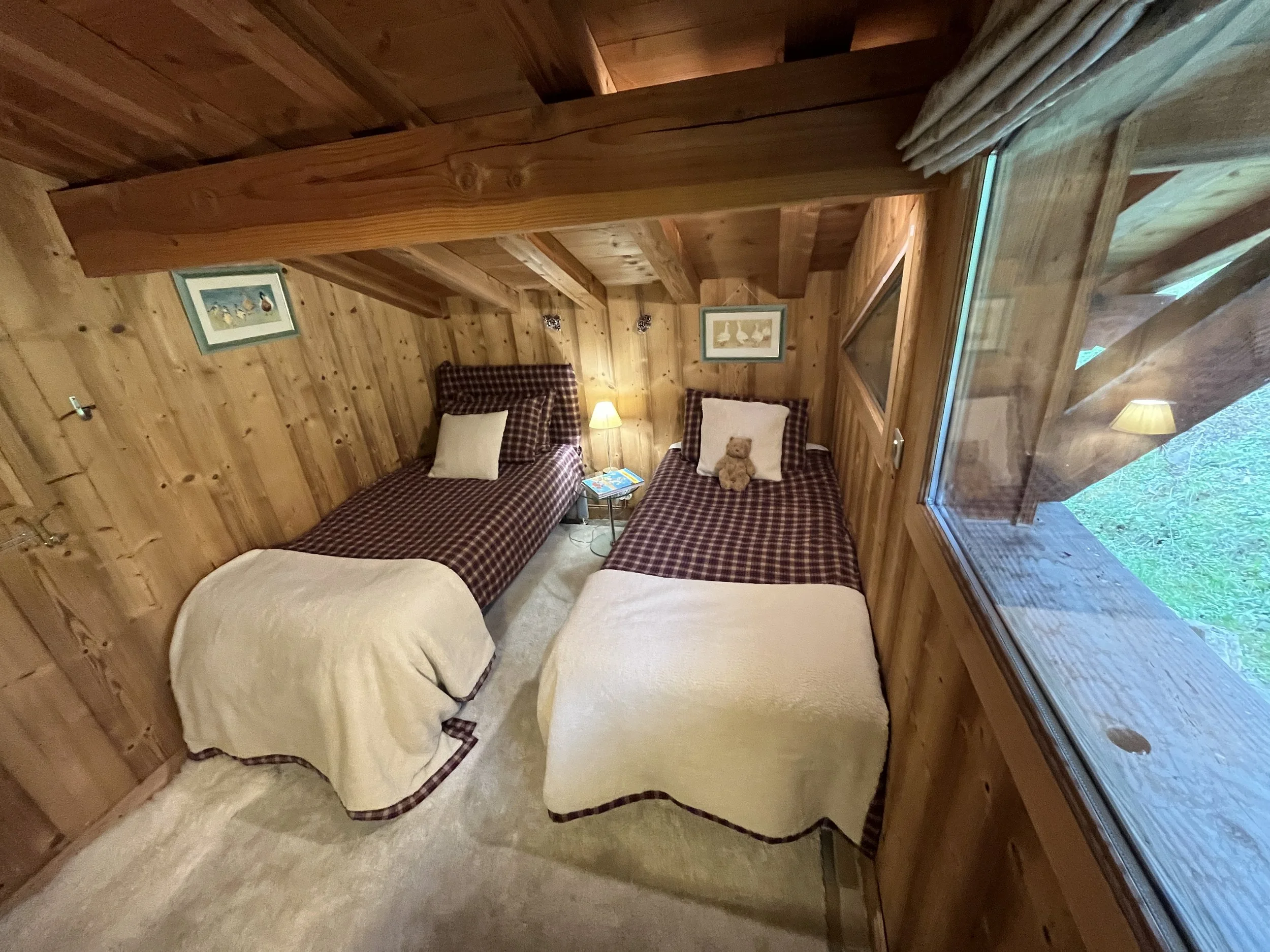 On the upper level, the main chalet has a fully equipped kitchen open to the dining room with exposed framework and large sliding windows giving access to the two terraces and the garden. A living room with wood stove, a second living room with a reading corner, a twin-bed bedroom and a large shower room with toilet complete this floor. On the second floor are 3 double bedrooms (one has an extra bed + drawer bed to sleep an additional 2 guest/kids) with exposed beams and a shower room with WC.